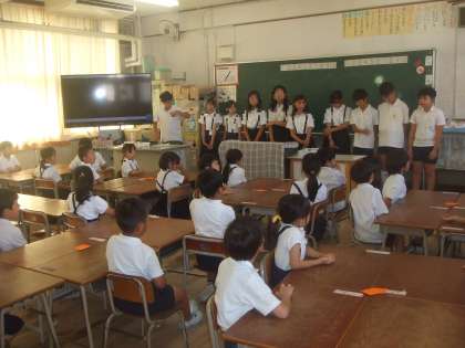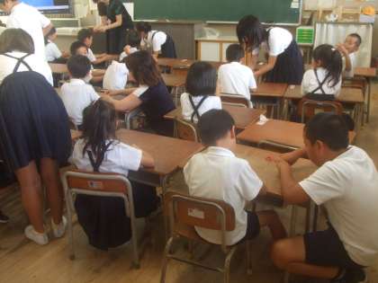 8月6日(火)平和登校日です。平和への祈りを込めて鶴を折っています。6年生のみなさんが1年生〜3年生のみなさんに鶴の折る方を教えています。写真は1年生の様子です。