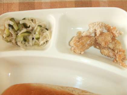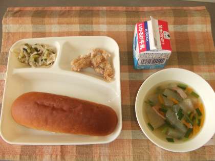 9月5日(木)の給食は鶏肉のから揚げ、とうがんの中華スープ、切り干し大根のごま辛みづけ、パン、牛乳です。鶏肉のから揚げはカラッと揚がっています。とうがんの中華スープはハム、とうがん、たまねぎ、にんじん、ニラが入ったあっさり味です。切り干し大根のごま辛みづけはきゅうりがはいっています。あっさりした味です。どれもおいしかったです。ごちそうさまでした。