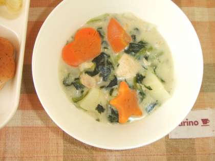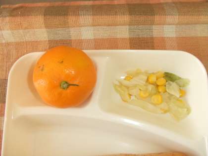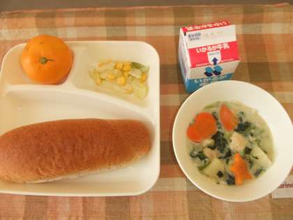 11月7日(木)の給食はほたて貝のクリームシチュー、キャベツとコーンのサラダ、みかん、パン、牛乳です。ほたて貝のクリームシチューはけいにく、ほたてかいばしら、じゃがいも、たまねぎ、ほうれんそう、にんじんが入っていてパンによくあいました。キャベツとコーンのサラダはあっさり味です。どれもおいしかったです。ごちそうさまでした。