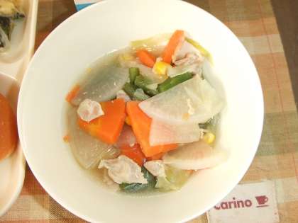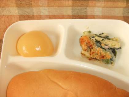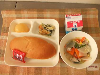 11月12日(火)の給食はスープ煮、ほうれんそうのグラタン、白桃(缶)、いちごジャム、パン、牛乳です。スープ煮はけいにく、だいこん、キャベツ、にんじん、さんどまめ、コーンをチキンブイオンにうすくちしょうゆでとてもおいしく味付けしています。ほうれんそうのグラタンはベーコン、マカロニ、たまねぎ、ほうれんそうが入っています。どれもおいしかったです。ごちそうさまでした。