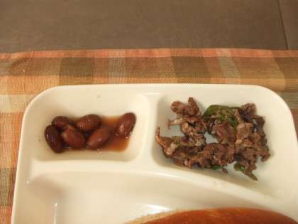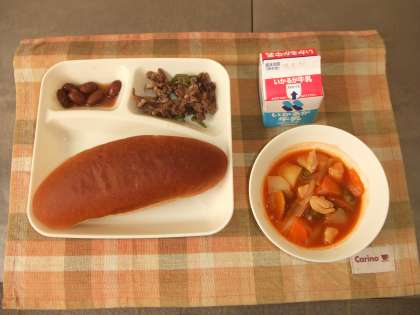 11月21日(木)の給食は牛肉の香味焼、ケチャップ煮、うずら豆のグラッセ、パン、牛乳です。牛肉の香味焼は牛肉にピーマンが入っています。ケチャップ煮はけいにく、じゃがいも、たまねぎ、にんじん、さんどまめが入ってケチャップの味が美味しいです。うずら豆のグラッセはほんのりとした甘みがします。どれもおいしかったです。ごちそうさまでした。