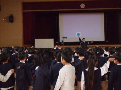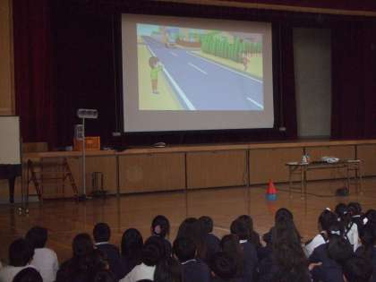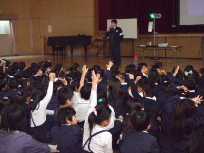 11月27日(水)2限目、1年生から3年生は体育館で交通安全指導を行いました。平野警察の方から歩行のしかた。信号の正しいわたり方を教えていただきました。子ども達は真剣に平野警察の方の話を聞いていました。
