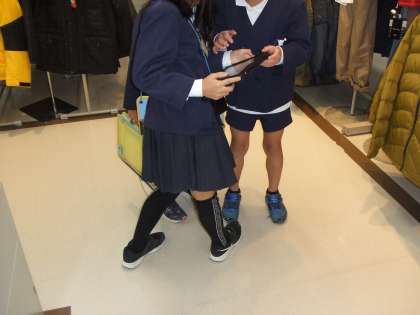 11月29日(金)3年生の社会科、ライフでタブレットを活用し買い物学習行っています。子ども達は店頭に並んだ商品を手に取って選んでいます。