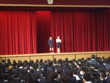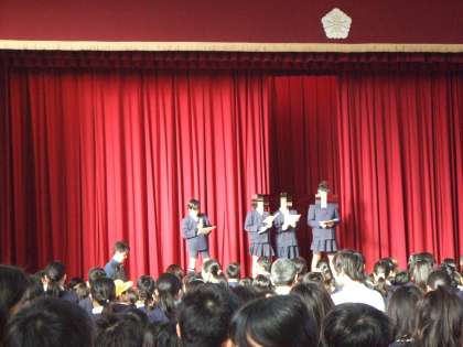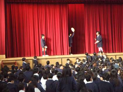 12月5日(水)寒い朝ですが子どもたちは元気です。今日の児童朝会は「投げたもの何?」です。舞台上、左から右にで投げられたものを当てます。投げられる瞬間、子ども達は静かに集中して舞台を見つめていました。楽しい時間でした。