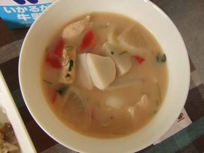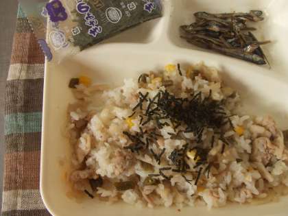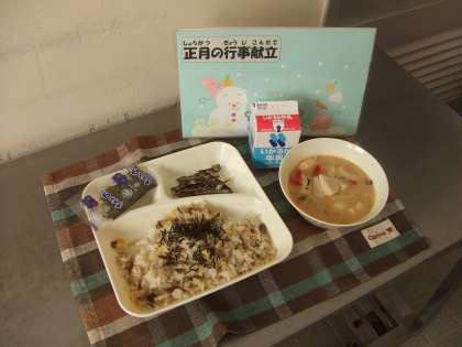 1月8日(水)の給食は「正月の行事献立」です。れんこんちらしずし、ぞう煮、ごまめ、牛乳です。れんこんちらしずしはぶたにく、れんこん、さんどまめ、コーン、かんぴょうが入っています。ぞう煮はけいにく、しらたまもち、さといも、だいこん、きんときにんじん、みつばが入っていてしろみそ、あかみその味付けです。ごまめは香ばしくできあがっていました。どれもおいしかったです。ごちそうさまでした。