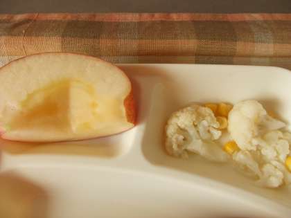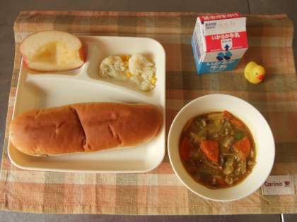 1月9日(木)の給食は豚肉と野菜のカレー煮、カリフラワーとコーンのサラダ、りんご、パン、牛乳です。豚肉と野菜のカレー煮はぶたにく、キャベツ、たまねぎ、にんじん、グリンピース、しめじが入っています。コクのあるカレーの味がしておいしかったです。カリフラワーとコーンのサラダはコーンが入っています。どれもおいしかったです。ごちそうさまでした。