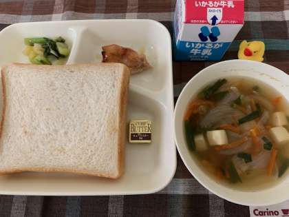 1月17日(金)の給食は鶏肉のオイスター焼き、えびととうふのスープ、チンゲンサイのピリ辛あえ、パン、牛乳、バターです。鶏肉のオイスター焼きはにんにく、しょうがの香りがしておいしかったです。えびととうふのスープはえび、とうふ、たまねぎ、にんじん、にらが入った中華スープです。チンゲンサイのピリ辛あえはチンゲンサイがやわらかくおいしかったです。ごちそうさまでした。