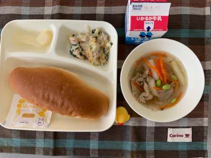 1月24日(金)の給食はマカロニグラタン、だいこんのスープ、和なし、マーマレード、パン、牛乳です。マカロニグラタンはけいにく、たまねぎ、ほうれんそうが入っています。だいこんのスープはぶたにく、じゃがいも、だいこん、にんじん、むきえだまめが入ったあっさりスープです。どれもおいしかったです。ごちそうさまでした。