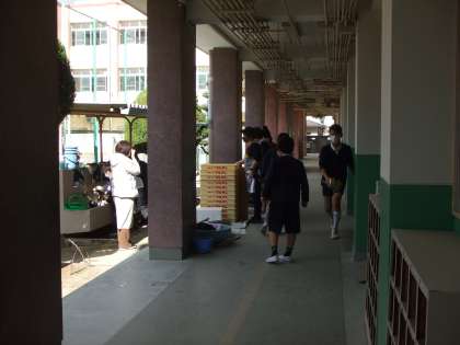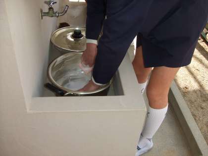 1月31日(金)PTAの皆さんと6年生の子ども達がもちつき大会の準備をしてくれています。男子は杵や餅箱、セイロを洗っています。女子はもち米を研いでいます。