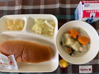 2月13日(木)の給食はほうれんそうのクリームシチュー、キャベツのサラダ、洋ナシ、りんごジャム、パン、牛乳です。ほうれんそうのクリームシチューはけいにく、じゃがいも、たまねぎ、ほうれんそう、にんじん、エリンギが入っています。キャベツのサラダはあっさり味です。どれもおいしかったです。ごちそうさまでした。