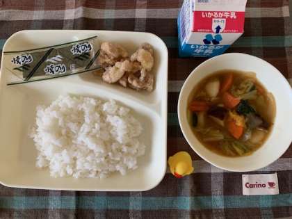 2月18日(水)の給食は鶏肉のから揚げ、まる天と野菜のうま煮、焼きのり、ごはん、牛乳です。鶏肉のから揚げはからっと揚っておいしかったです。まる天と野菜のうま煮はまるてん、はくさい、たまねぎ、チンゲンサイ、にんじん、しいたけが入っています。どれもおいしかったです。ごちそうさまでした。