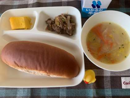 2月25日(火)の給食は牛肉のデミグラスソース煮、コーンスープ、かぼちゃプリン、パン、牛乳です。牛肉のデミグラスソース煮は牛肉、たまねぎが入っています。コーンスープはベーコン、はくさい、コーン、にんじんが入ったスープです。かぼちゃプリンもおいしかったです。ごちそうさまでした。