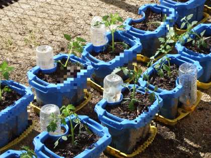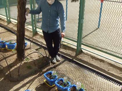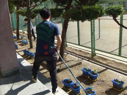 5月7日(木)2年生の先生方は昼からミニトマトの苗を植えました。元気に育つように水をあげています。