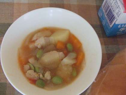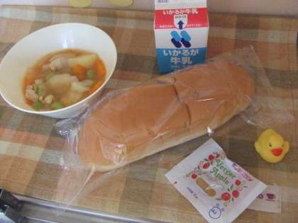 6月8日(月)の給食はフレッシュトマトのスープ煮、パン、牛乳です。フレッシュトマトのスープ煮はけいにく、じゃがいも、たまねぎ、トマト、にんじん、むきえだまめが入ったあっさりスープ煮です。パンにはリンゴジャムが付いていました。おいしかったです。ごちそうさまでした。