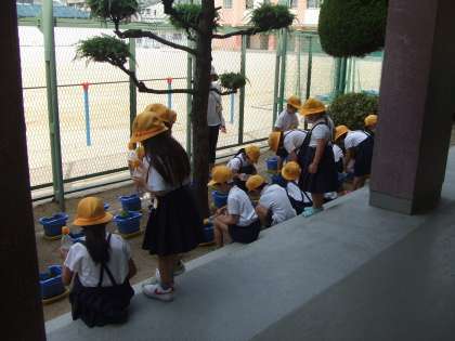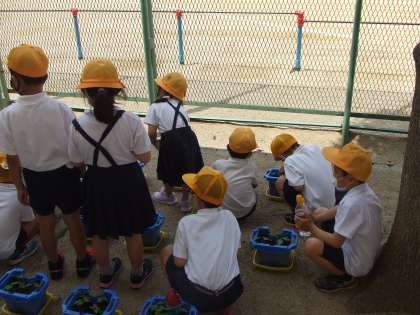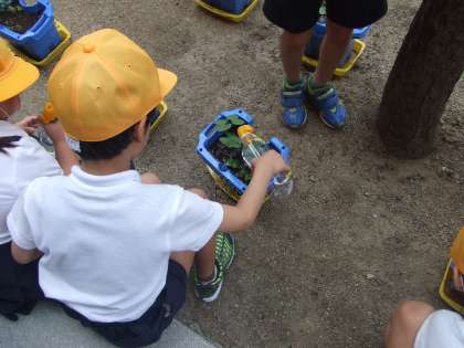 6月9日(火)1年生は朝顔に水をあげています。何色の花が咲くかな?楽しみです。