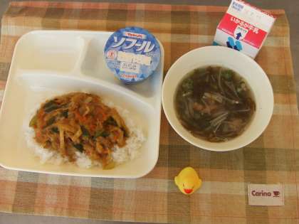 6月17日(水)の給食は和風カレー丼、もずくとオクラのとろり汁、ヨーグルトです。