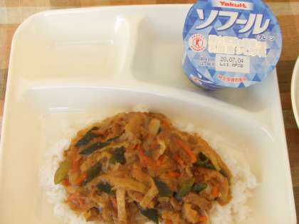 和風カレー丼はぶたにく、うすあげ、たまねぎ、にんじん、あおねぎ、しょうがが入っています。もずくとオクラのとろり汁はけいにく、ブラックマッペもやし、オクラ、えのきたけ、もずくが入っています。ヨーグルトは子ども達から人気があります。どれもおいしかったです。ごちそうさまでした。