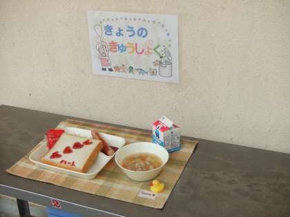 6月18日(木)給食のメニューのサンプルが給食室の外に展示されています。子ども達には大好評です。