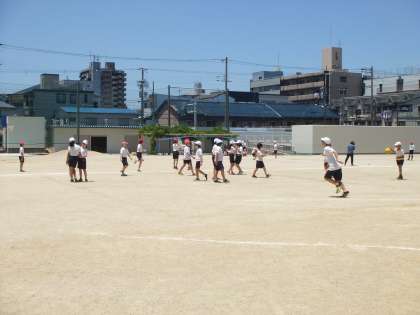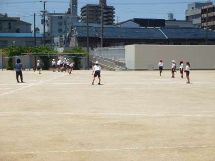 6月23日(火)5年生は運動場で体育です。暑い日差しの中、がんばっています。