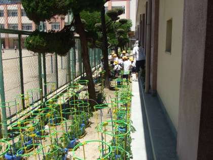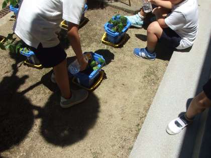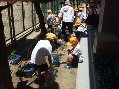 6月23日(火)1年生は大切に育てている朝顔に水をあげています。