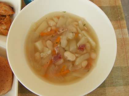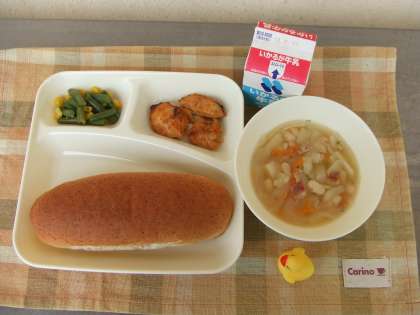 6月25日(木)の給食は鶏肉のカレーマヨネーズ焼き、てぼ豆のスープ、さんどまめとコーンのサラダ、パン、牛乳です。鶏肉のカレーマヨネーズ焼きはマヨネーズにカレーの風味です。てぼ豆のスープはベーコン、てぼまめ、じゃがいも、たまねぎ、にんじん、パセリが入ったチキンブイヨンのあっさりスープです。さんどまめとコーンのサラダはさんどまめにコーンが入っています。どれもおいしかったです。ごちそうさまでした。
