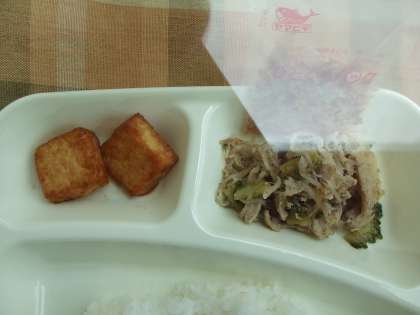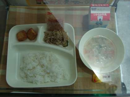 7月8日(水)の給食はゴーヤチャンプルー、すまし汁、あつあげのしょうがじょうゆかけ、ごはん、牛乳です。ゴーヤチャンプルーはぶたにく、ブラックマッペもやし、にがうりが入っています。すまし汁はけいにく、キャベツ、たまねぎ、にんじん、あおねぎが入っています。あつあげのしょうがじょうゆかけはあっさりしょうゆ味です。今日はは鰹節が付いていした。どれもおいしかったです。ごちそうさまでした。