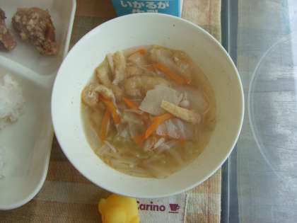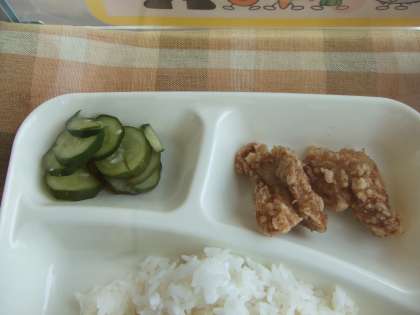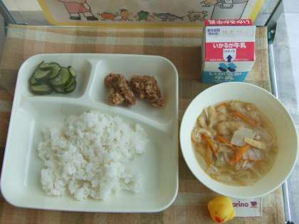 7月10日(金)の給食は豚肉の香味あげ、すまし汁、あっさりきゅうり、ごはん、牛乳です。豚肉の香味あげは子ども達の人気メニュー、からっと揚っておいしかったです。すまし汁はうすあげ、キャベツ、たまねぎ、にんじん、えのきたけが入っています。どれもおいしかったです。ごちそうさまでした。