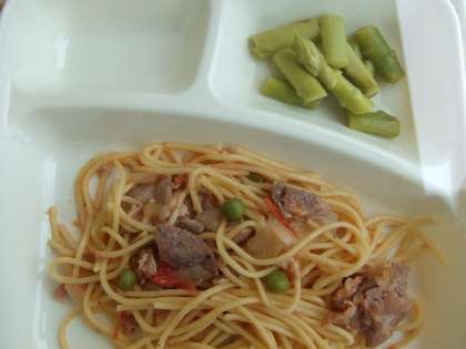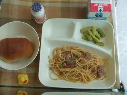 7月13日(月)の給食はポークトマトスパゲッティ、グリーンアスパラガスのサラダ、発酵乳、パン、牛乳です。ポークトマトスパゲッティは豚肉、ベーコン、スパゲッティ、たまねぎ、トマト、グリンピース、にんにくが入っています。グリーンアスパラガスのサラダはアスパラガスのシャキシャキ感がありました。発酵乳は人気です。おいしかったです。ごちそうさまでした。