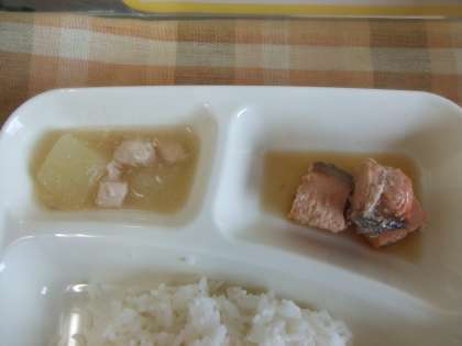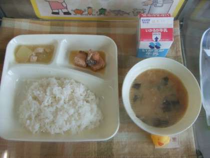 7月14日(火)の給食はさけのつけやき、みそ汁、とうがんの煮もの、ごはん、牛乳です。さけのつけやきはご飯によく合うおいしい味です。みそ汁はじゃがいも、うすあげ、たまねぎ、にんじん、ブラックマッペもやし、わかめが入っています。とうがんの煮ものはけいにく、とうがんをみりんやしょうゆで味付けしています。おいしかったです。ごちそうさまでした。