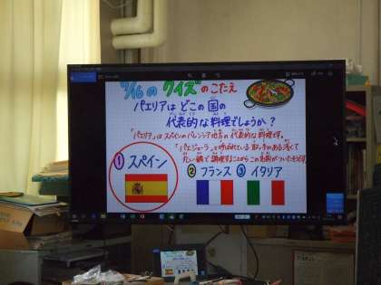 7月16日(木)給食委員のみなさんが今日のパエリアについてのすききらい調べをしています。パエリアは人気です。パエリアはどこの国の料理でしょうか。答えは下の写真です。