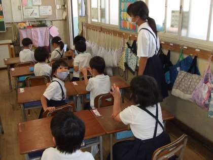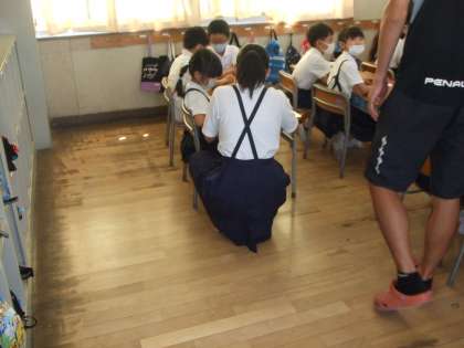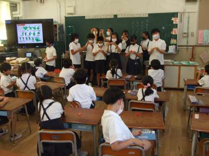 8月6日(木)今日は平和について考える日です。各クラスで平和への祈りを込めて千羽鶴を折っています。6年生のみなさんは1年生に千羽鶴の折り方を教えています。
