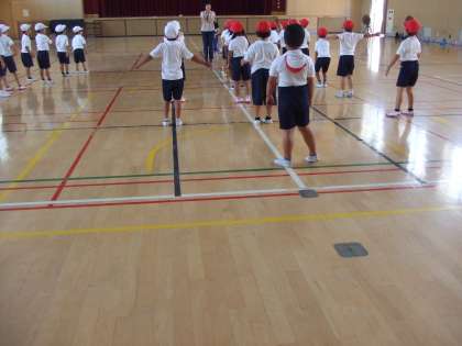 8月26日(水)1年生は体育館で体育です。体育館も暑いですが子ども達は元気に頑張っています。
