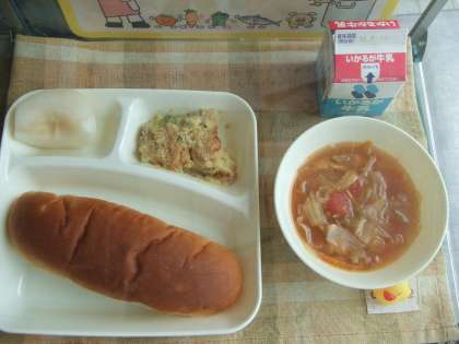 9月2日(水)の給食は豆乳マカロニグラタン、トマトスープ、なし(二十世紀)、パン、牛乳です。豆乳マカロニグラタンはベーコン、マカロニ、マッシュルーム、グリンピースが入っています。トマトスープはけいにく、キャベツ、トマト、にんじん、セロリ、にんにくが入っています。おいしかったです。ごちそうさまでした。