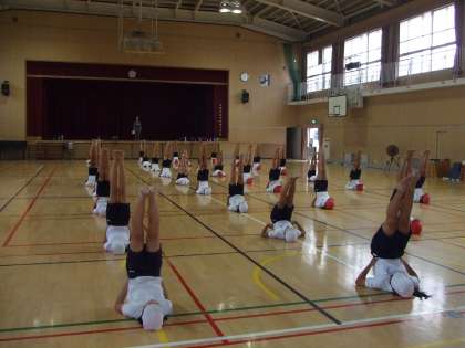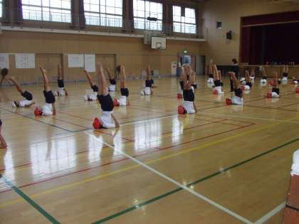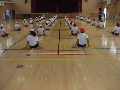 8月4日(金)6年生は体育館で体育参観に向けての練習を行っています。
