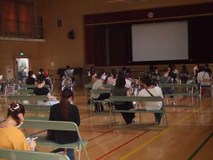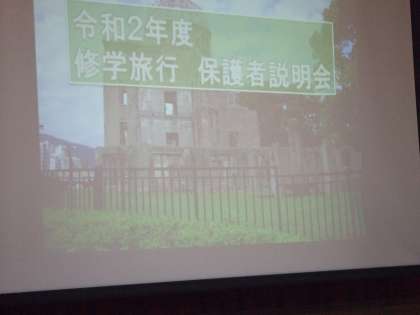 8月4日(金)修学旅行説明会を行いました。朝からの雨は上がったのですが湿度が高く暑くなってきていました。そんな中、多くの保護者の方にご来校いただきました。暑い中、ありがとうございました。