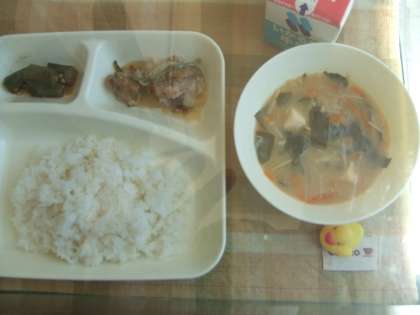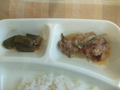 9月8日(火)の給食は豚肉の甘辛焼き、みそ汁、オクラのおかかいため、ごはん、牛乳です。豚肉の甘辛焼きはぶたにく、たまねぎ、ピーマンを甘辛く焼いています。みそ汁はとうふ、キャベツ、にんじん、ブラックマッペもやし、えのきたけ、わかめ、が入っています。オクラのおかかいためはオクラにかつおぶしをまぶし甘辛く味付けています。おいしかったです。ごちそうさまでした。