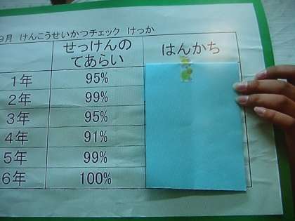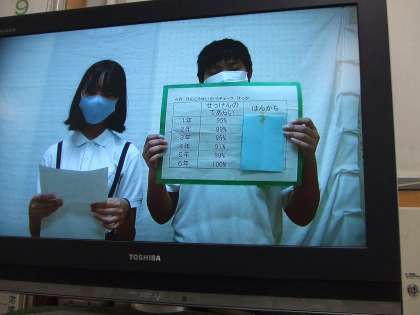 9月10日(木)テレビでの児童朝会を行った後、7保健委員会から手洗いやハンカチについての調査の発表がありました。