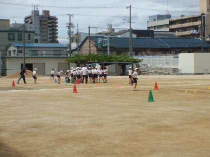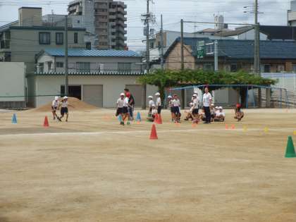9月14日(月)4年生は運動場でリレーの練習をしています。
