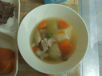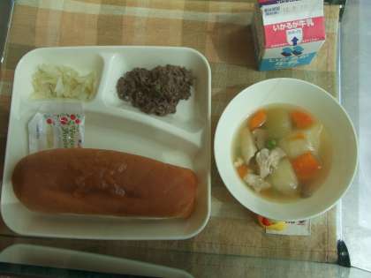 9月14日(月)の給食は牛肉の香味焼き、スープ煮、サワーキャベツ、パン、牛乳です。牛肉の香味焼きは牛肉、ピーマンが入っています。スープ煮はけいにく、じゃがいも、たまねぎ、にんじんが、グリーンピース、マッシュルームが入っています。おいしかったです。ごちそうさまでした。
