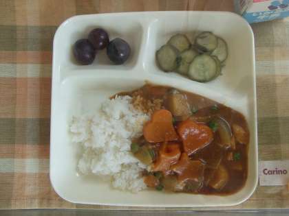 9月17日(木)の給食はチキンカレーライス、きゅうりのピクルス、巨峰です。チキンカレーライスはけいにく、じゃがいも、たまねぎ、にんじん、グリンピース、が入っています。人気メニューです。