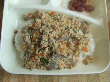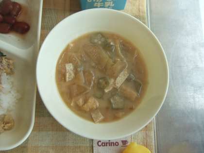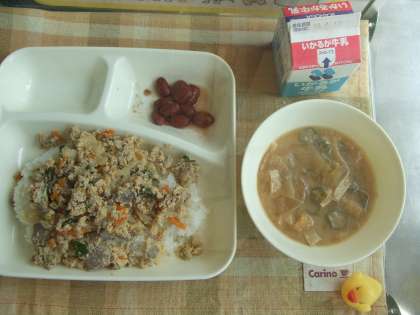 9月18日(金)の給食は他人丼、とうがんのみそ汁、金時豆の煮ものです。他人丼はぎゅうにく、けいらん、たまねぎ、にんじん、あおねぎ、が入っています。とうがんのみそ汁はうすあげ、とうがん、オクラ、が入っています。おいしかったです。ごちそうさまでした。