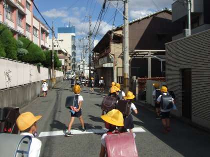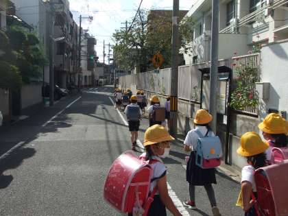9月28日(月)爽やかな秋空の下、一日の活動を終えて子ども達は下校しています。