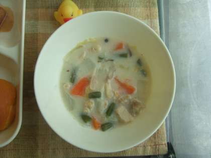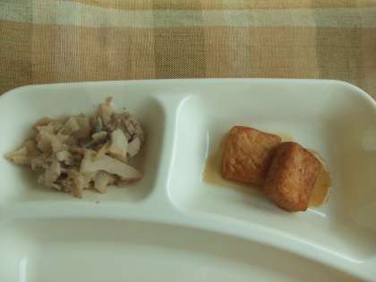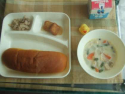 10月7日(水)の給食ははくさいのクリーム煮、あつあげのピリ辛じょうゆかけ、豚肉とれんこんのオイスターそーすいため、パン、牛乳です。はくさいのクリーム煮はけいにく、はくさい、たまねぎ、にんじん、さんどまめ、しめじ、が入っています。あつあげのピリ辛じょうゆかけはあつあげをピリッと甘辛く味付けしています。豚肉とれんこんのオイスターそーすいためはぶたにくにれんこんが入っています。おいしかったです。ごちそうさまでした。