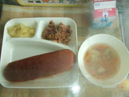 10月14日(火)の給食は豚肉と野菜のケッチャプソテー、スープ、スイートポテト、パン、牛乳です。豚肉と野菜のケッチャプソテーはぶたにく、たまねぎ、ピーマン、が入って、ケッチャプやウスターソースで味付けしています。スープはけいにく、はくさい、にんじん、コーン、が入っています。スープ、スイートポテトは甘くおいしかったです。ごちそうさまでした。