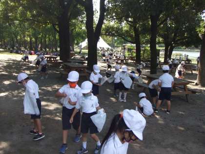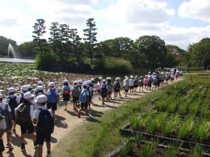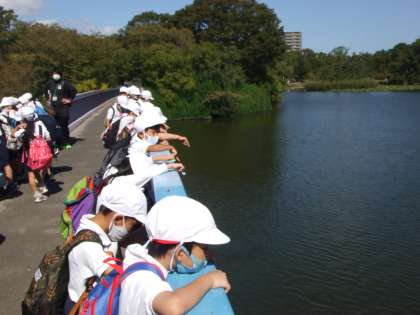 10月15日(木)1年生は爽やかな秋空の下、長居公園へ体験学習に行きました。植物園での様子です。自然史博物館へ移動しています。池には大きな鯉がたくさん泳いでいます。