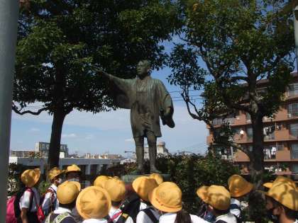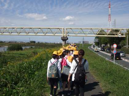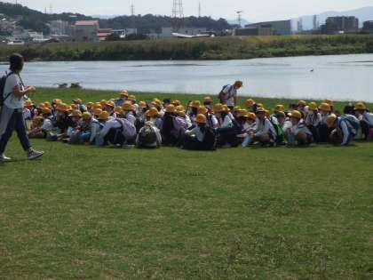 10月16日(金)4年生は柏原市立歴史資料館・大和川へ社会見学に行きました。爽やかな秋空の下、大和川の歴史について勉強しました。河川敷に移動しお弁当の時間です。