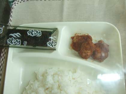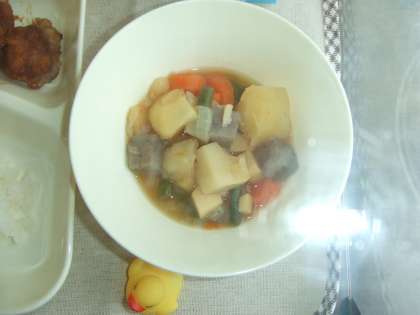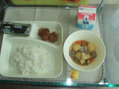 10月19日(月)の給食はみそカツ、じゃがいもと野菜の煮もの、焼きのり、ごはん、牛乳です。みそカツはカツにはっちょうみそやあかみそで味付けしてあります。じゃがいもと野菜の煮ものはじゃがいも、こんにゃく、たまねぎ、たけのこ、にんじん、さんどまめがはいっています。おいしかったです。ごちそうさまでした。