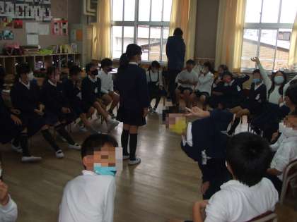 10月23日(金)雨で外で遊べません。4年生の教室ではクラス全員でゲームをしています。