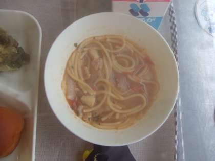 10月23日(金)の給食は牛肉のカレー風味焼き、ほたて貝とトマトのスープスパゲッティ、きゅうりのサラダ、パン、牛乳です。牛肉のカレー風味焼きはぎゅうにく、キャベツ、ピーマンをカレー味にしています。ほたて貝とトマトのスープスパゲッティはほたてかいばしら、ベーコン、スパゲッティ、たまねぎ、トマト、パセリ、にんにくが入っています。おいしかったです。ごちそうさまでした。