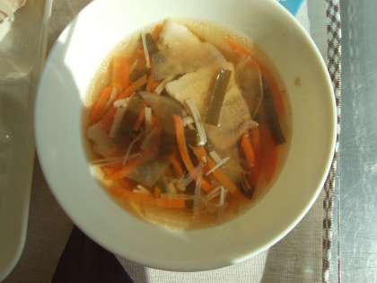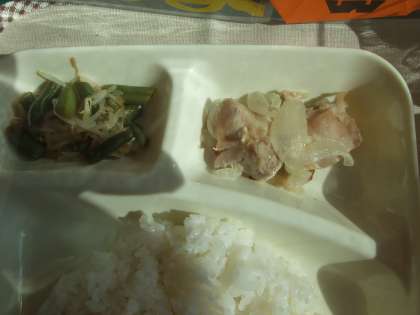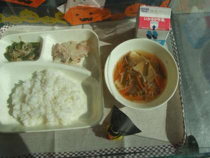 10月26日(月)の給食は鶏肉のゆず塩焼き、ソーキ汁、もやしとさんどまめの甘酢あえ、ごはん、牛乳です。鶏肉のゆず塩焼きはけいにく、たまねぎにゆずのかじゅうとしおで味い付けしています。ソーキ汁はぶたにく、だいこん、にんじん、しろねぎ、えのきたけ、きりこんぶが入っています。もやしとさんどまめの甘酢あえはブラックマッペもやし、さんどまめを甘酢で味付けしています。おいしかったです。ごちそうさまでした。